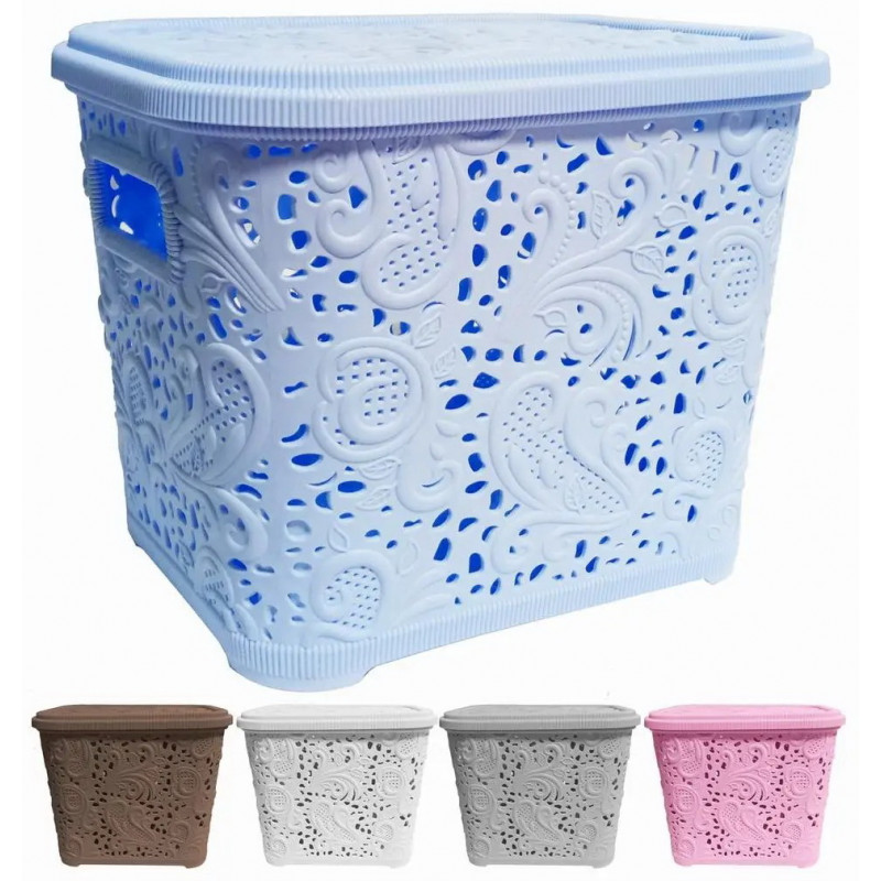 Корзина ажур 3,5л с крышкой предназначена для хранения предметов, мелких вещей, отлично подойдет для хранения белья, детских товаров, игрушек, косметики, канцелярских или швейных принадлежностей, и других полезных мелочей. Контейнер изготовлен из высококачественного, цветного пластика, безопасного для здоровья.