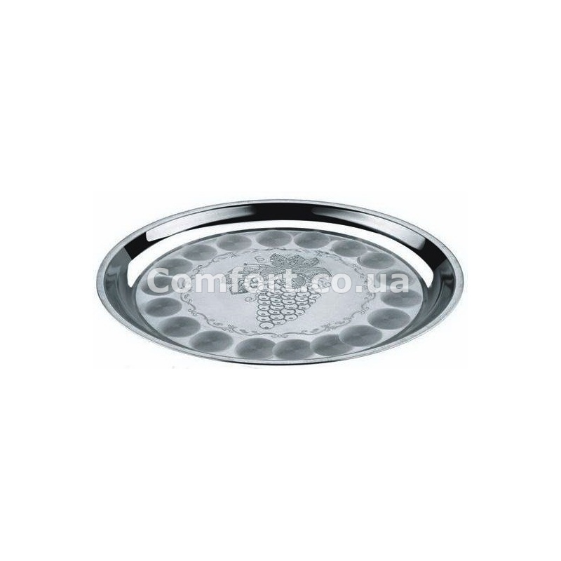 Поднос изготовлен из высококачественной, нержавеющей стали, что обеспечивает данному товару надежное и долговечное использование. Поднос имеет круглую форму с бортиком и поверхность с декором в виде грозди винограда. Наличие прямых бортиков обеспечивает удобство при подаче и сервировке различной посуды, чайных и кофейных принадлежностей. Также разнос может использоваться для красивой подачи десертов, фруктов, различной нарезки и других напитков и блюд.