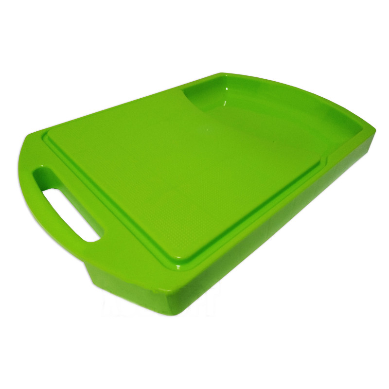 Доска кухонная разделочная с ручкой и лотком для нарезанных продуктов прямоугольной формы, идеальна для нарезки овощей, фруктов, мяса, рыбы, выпечки и других продуктов. На верхней части разделочной доски имеется ребристая поверхность для более удобного нарезания. После использования доска для нарезки легко моется даже под струей холодной воды.