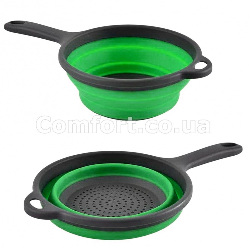 Дуршлаг складной силиконовый с ручкой – это удобный и практичный кухонный инвентарь и незаменимый помощник на каждой кухне. Дуршлаг круглой формы с ручкой, применяется для кухонных потребностей: промыть зелень, овощи и фрукты, а также, чтобы сцедить жидкость при приготовлении макарон или других горячих или холодных блюд.