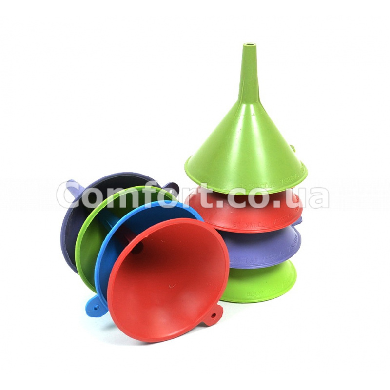 Воронка пластмассовая необходимый предмет на кухне каждой хозяйки, предназначена для перелива жидкости и пересыпания сыпучих продуктов, в емкость с узким горлышком. Лейку воронку можно использовать на кухне, на даче или в гараже. Воронка круглой формы, изготовлена из цветной, высококачественной, пищевой пластмассы.
