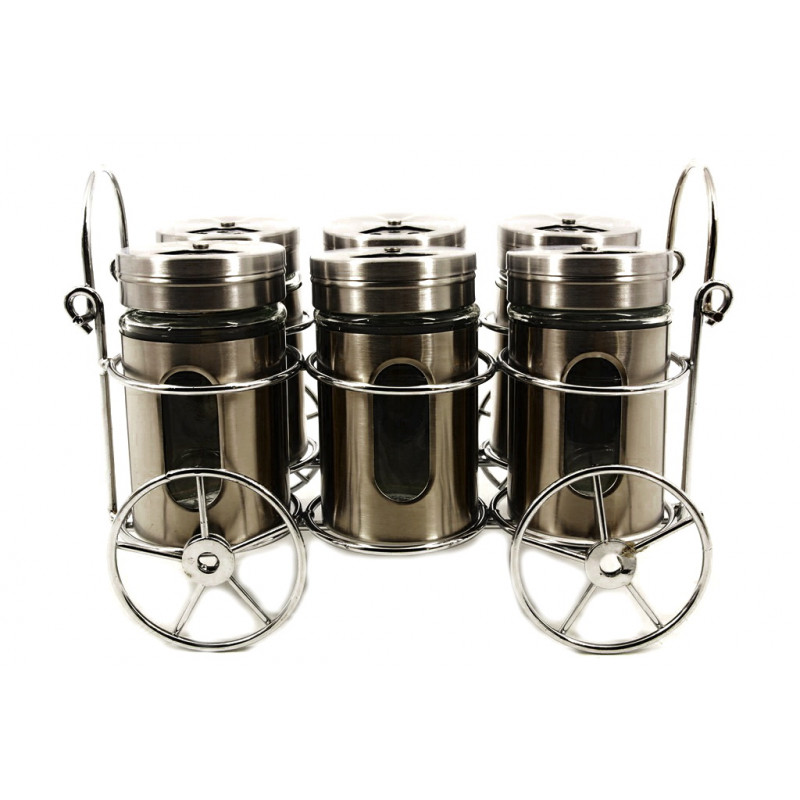 Набор специй состоит из шести стеклянных емкостей и металлической подставки в виде тачки.