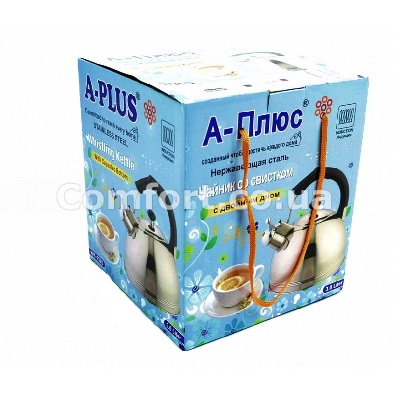 Чайник для плиты изготовлен из высококачественной нержавеющей стали с зеркальной полировкой, отличается чрезвычайной прочностью и долговечностью, обладает высокими гигиеничными и антикоррозийными свойствами, а также не требует особого ухода и легко моется. Чайник оснащен бакелитовой ручкой, которая не нагревается в процессе эксплуатации. Благодаря насадке-свистку Вы точно будете знать о моменте закипания воды. Объем: 3л.