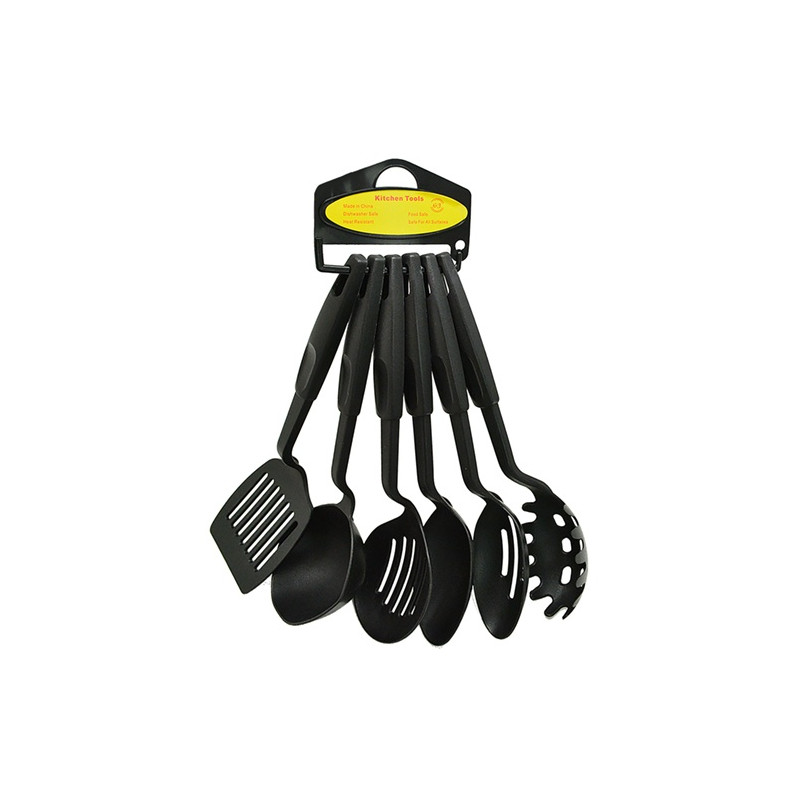 Кухонный набор состоит из 6 предметов, без которых сложно представить современную кухню. Набор кухонных принадлежностей собрал в себе все необходимое, для того чтобы процесс приготовления стал желанным и комфортным. Используя кухонные предметы, можно значительно упростить процесс и сократить время приготовления блюд. Набор изготовлен из прочного, качественного термостойкого пластика, который безвреден для здоровья, не изменяет вкус и запах пищи, выдерживает воздействие высоких температур до 210С. Удобный и практичный набор кухонных принадлежностей необходим на каждой кухне, не занимает много места, все нужные предметы всегда под рукой. На конце ручки каждого кухонного предмета есть отверстие для подвешивания, что поможет держать набор в порядке, рационально использовать пространство и экономить место на кухни. Набор кухонных принадлежностей можно использовать для посуды с тефлоновым покрытием. Компактный набор кухонных предметов не только поможет приготовить разнообразные блюда, но и станет незаменимым помощником и настоящим украшением на Вашей кухни, который прослужит долгие годы. Такой набор кухонных принадлежностей станет хорошим и практичным подарком для родных и близких.