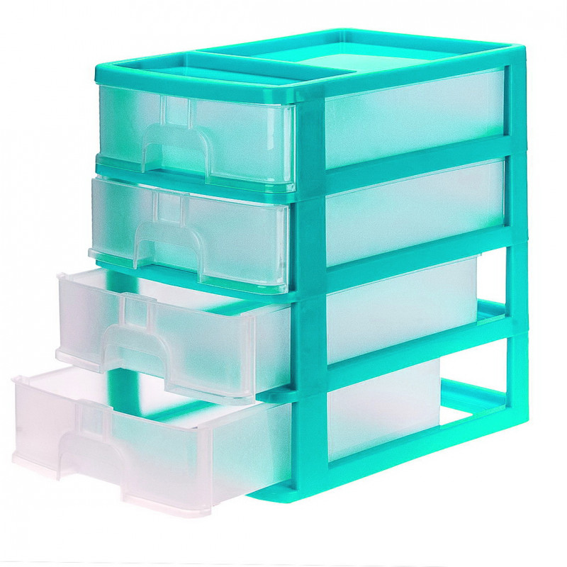 Комодик мини настольный большой имеет четыре прозрачных выдвижных ящика, в которые легко помещаются все необходимые мелочи. Комодик используется для хранения офисной бумаги формата А4, в один ящик вмещается до 500 штук листов, так же удобно складывать канцелярские принадлежности, предметы для творчества, цветные карандаши, детские игрушки, предметы личной гигиены, косметику, салфетки и другие необходимые мелочи. Комод мини изготавливают из цветной высококачественной пластмассы. Пластиковый мини комодик практичный и компактный, устойчив к перепадам температуры, что позволяет размещать его в ванной, на кухне, в детской, в кладовой комнате и в любом другом необходимом помещении. Комодик удобный и быстро собирается, а благодаря незначительному весу его можно легко переносить в любую комнату. Мини комодик помогает упорядочить мелкие вещи, это необходимый предмет для тех, кто любит порядок и предпочитает, чтобы каждая вещь имела свое место.