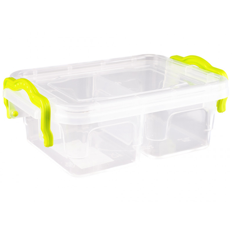 Контейнер пластмассовый двойной 0,5л универсальный, пищевой с ручками защелками, предназначен для хранения, транспортировки продуктов или готовых блюд и их заморозки или разогрева. Бокс для продуктов разделен на две части, удобно использовать для разных несовместимых продуктов. Емкость прямоугольной формы комплектуется крышкой, которая плотно закрывается и дополнительно фиксируется ручками контейнера, это препятствует случайному открытию крышки. Прозрачные стенки судочка позволяют видеть содержимое в нем.