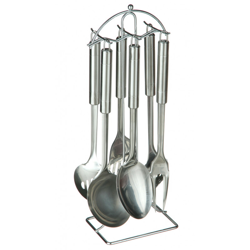 Набор кухонный металлический на стойке необходим на каждой кухне. Набор поможет приготовить разнообразные блюда и станет настоящим украшением кухни, в красивой коробке, отличный подарок для родных и близких. Компактная подставка-вешалка поможет держать набор в порядке и рационально использовать пространство кухни. Состав набора: ложка гарнирная, ложка с дырками, пресс для картофеля, шумовка, половник, лопатка, стойка. Набор кухонный изготовлен из нержавеющей стали.
