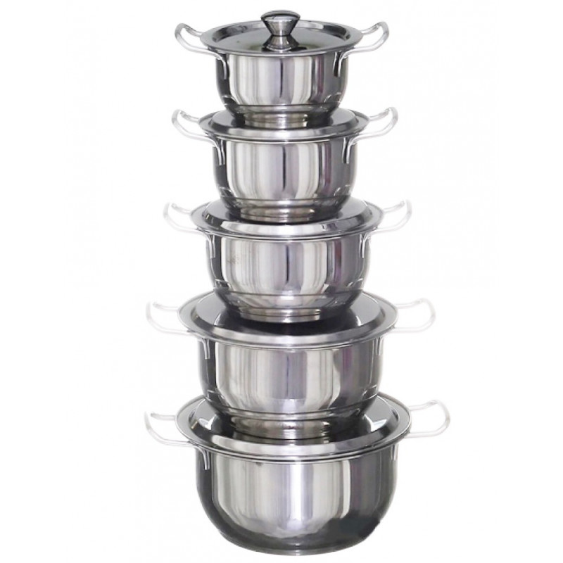 Набор кастрюль изготовлен из высокопрочной нержавеющей стали, не подвергающейся коррозии и потускнению, имеет капсульное дно. Также отличается высокой теплопроводностью и распределением температуры, что обеспечивает быстрое и равномерное нагревание и длительное удержание тепла. Клепанные ручки не нагреваются. Набор кастрюль комплектуется металлическими крышками, идеально подходит для ежедневного использования. Набор состоит из пяти кастрюль: 14см, 16см, 18см, 20см, 22см. Объем: 1л, 1,3л, 1,7л, 2,4л, 3,4л.