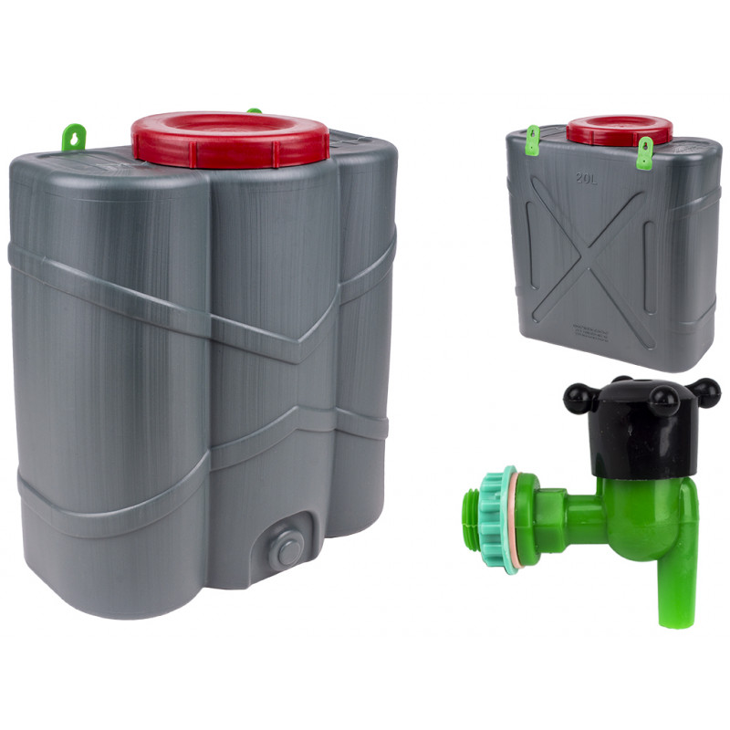 Рукомойник 20л с крышкой выполнен в виде объемного прямоугольника, компактный и удобный в применении. В верхней части находится заливное отверстие, которое закрывается винтовой крышкой, в нижней части находится отверстие для среза и крепления съемного крана, который имеется в комплекте. Большое горлышко придает удобство во время процесса заполнения канистры водой.