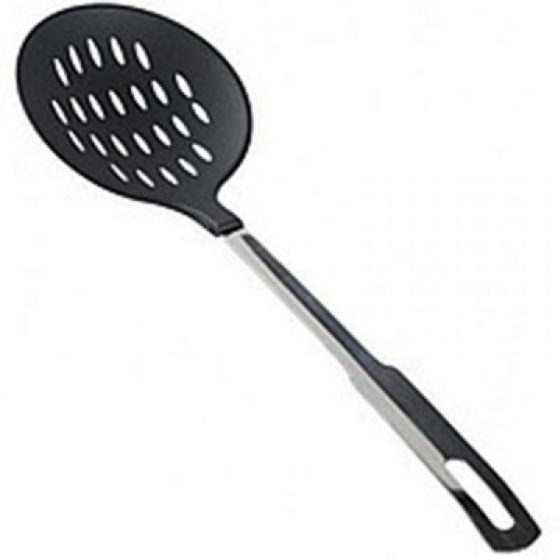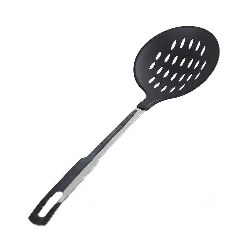 Набор кухонных принадлежностей не будет полным без шумовки. Используется для снятия пены, для извлечения продуктов из бульонов, таких как мяса, рыбы, вареников, пельменей и других. Ручка шумовки изготовлена из высококачественной нержавеющей стали, основание тефлон. Шумовка легко моется, также пригодна для мытья в посудомоечной машине. Имеет удобную ручку с петлей для подвешивания. Лаконичный стильный дизайн подойдет к интерьеру любой кухни. Длина 37см.