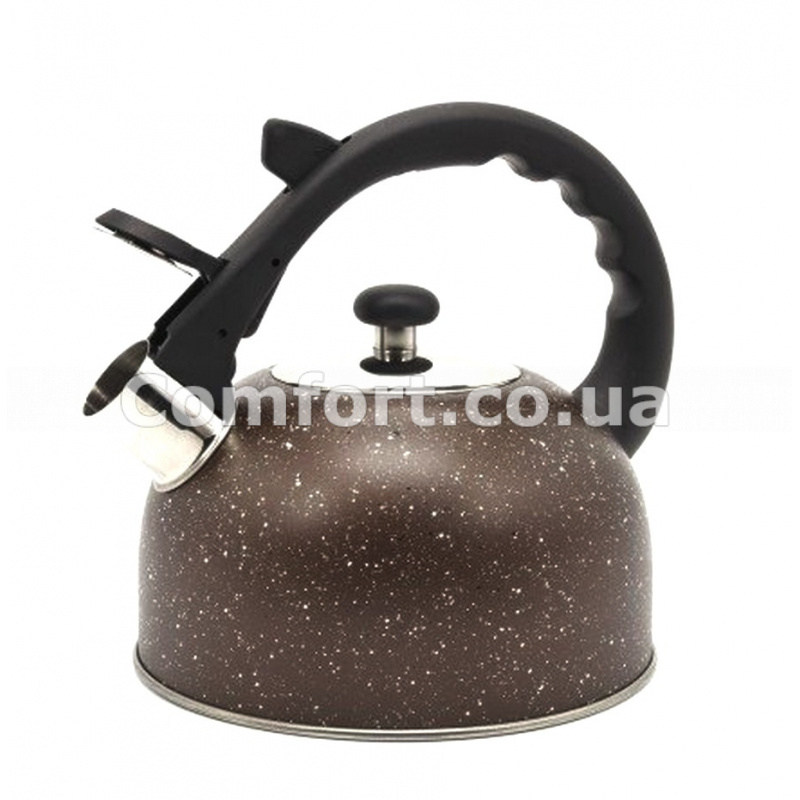 Чайник изготовлен из нержавеющей стали высокого качества с сатинированной полировкой поверхности. Чайник с двойным дном прочный, долговечный и экологичный, легко очищается. Чайник 2,5л мрамор оснащен свистком, который даст понять, что вода закипела. С помощью удобного механизма свисток открывается легко и безопасно. Для Вашей безопасности у чайника бакелитовая термоустойчивая ручка, что предотвращает возможность обжечься. Чайник мрамор станет отличным помощником на кухне любой хозяйке, подходит для использования на плитах всех видов. Чайник упакован в коробку, имеет уникальный современный дизайн и может стать отличным вариантом для подарка. Чайник прекрасно подходит для оборудования общепита. Объем: 2,5л.