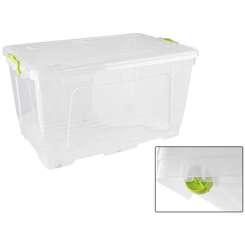 Бокс контейнер пластмассовый Big Box 80л пищевой, с ручками защелками, на колесиках, предназначен для хранения и транспортировки продуктов, вещей, одежды, детских игрушек и других мелких бытовых предметов. Универсальный контейнер прямоугольной формы комплектуется крышкой, которая плотно закрывается и дополнительно фиксируется ручками контейнера, это препятствует случайному открытию крышки, а также бережет вещи от сырости и пыли. Благодаря небольшим колёсикам в количестве 6-и штук, прикреплённым к днищу контейнера, не нужно каждый раз поднимать ящик с вещами или продуктами, достаточно просто выдвинуть его. Прозрачные стенки бокса позволяют видеть содержимое в нем. Бокс контейнер изготовлен из высококачественного, пищевого пластика, который может контактировать с пищей, абсолютно безопасный для здоровья, не содержит вредных веществ.