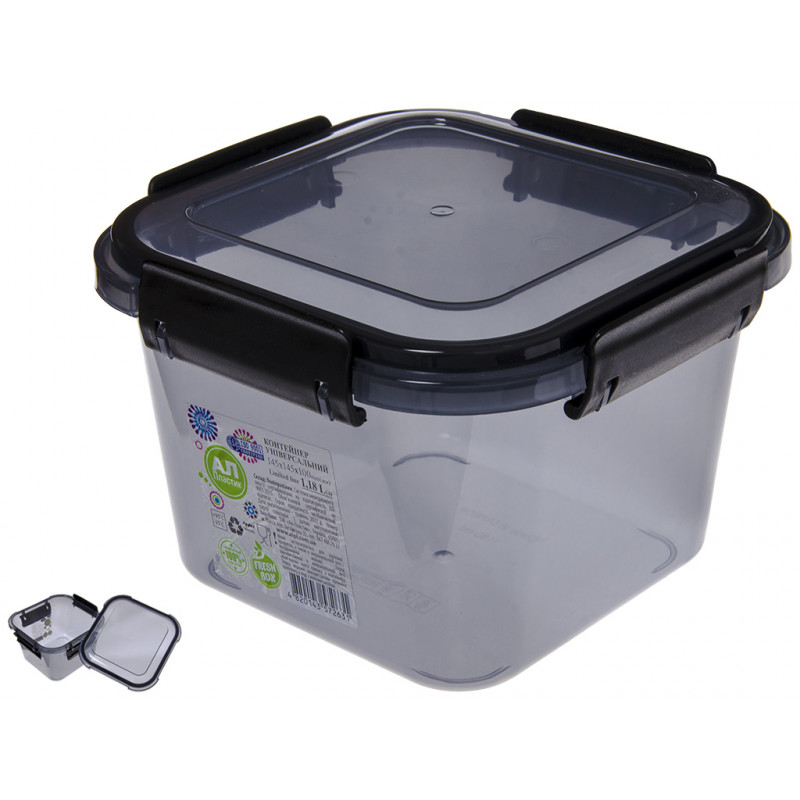 Контейнер черный прозрачный 1,18л с герметичной крышкой, квадратной формы, изготовлен из высококачественной пищевой пластмассы, которая может контактировать с пищей, абсолютно безопасна для здоровья, не содержит вредных веществ, не впитывает посторонние запахи и не имеет своего. Емкость для продуктов предназначена для хранения и транспортировки свежих и замороженных продуктов, ягод, фруктов, овощей, а также удобно использовать для разогрева пищи в микроволновой печи. Боксы контейнеры из пищевого пластика с защелками незаменимы для тех, кто любит отдыхать на природе. Емкость комплектуется крышкой, которая плотно закрывается, это препятствует случайному открытию крышки.