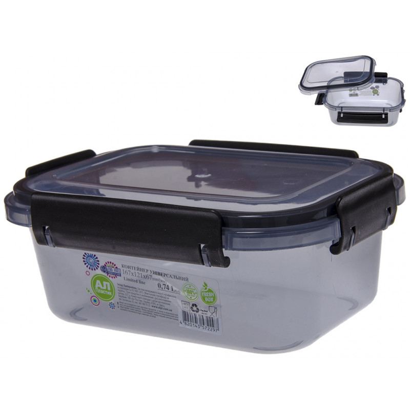 Контейнер черный прозрачный 0,74л с герметичной крышкой, прямоугольной формы, изготовлен из высококачественной пищевой пластмассы, которая может контактировать с пищей, абсолютно безопасна для здоровья, не содержит вредных веществ, не впитывает посторонние запахи и не имеет своего. Емкость для продуктов предназначена для хранения и транспортировки свежих и замороженных продуктов, ягод, фруктов, овощей, а также удобно использовать для разогрева пищи в микроволновой печи. Боксы контейнеры из пищевого пластика с защелками незаменимы для тех, кто любит отдыхать на природе. Емкость комплектуется крышкой, которая плотно закрывается, это препятствует случайному открытию крышки.