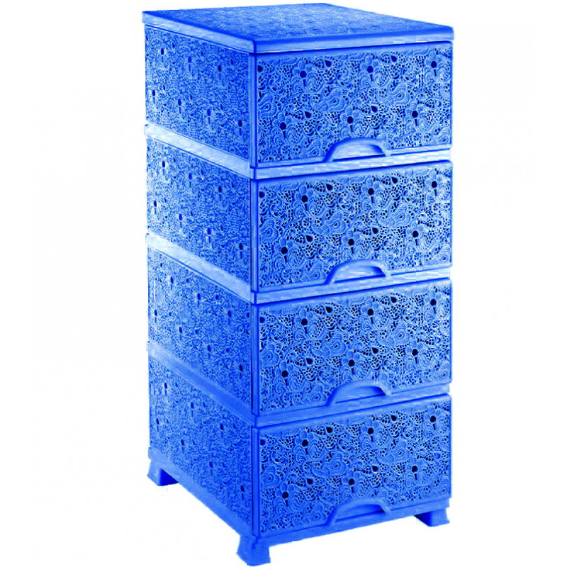 Комод ажурный люкс пластмассовый имеет четыре выдвижных ящика, в которые легко помещаются все необходимые вещи. Комод используется для хранения одежды, постельного белья, детских игрушек, предметов личной гигиены, банных принадлежностей, косметики, полотенец, салфеток и других необходимых мелочей. Напольный комод изготавливают из цветной высококачественной пластмассы, декорируют ажурным узором.