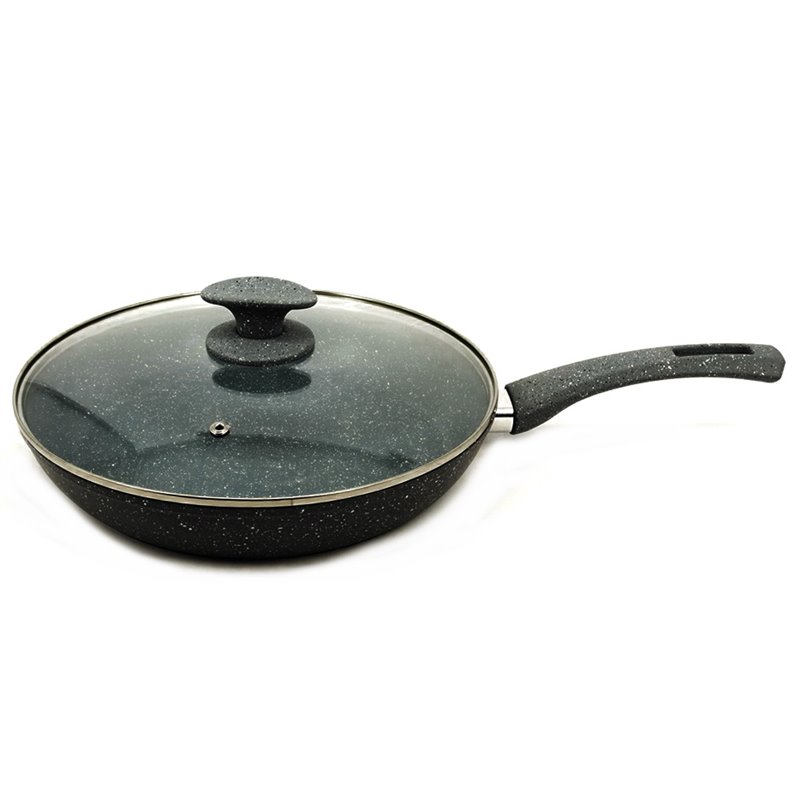 Сковорода 28см з кришкою виготовлена з якісного литого алюмінію з мармуровим покриттям, яке акумулює тепло рівномірно розподіляючи його по поверхні. Сковорода зі скляною кришкою пристосована для виготовлення на всіх сучасних типів плит.
