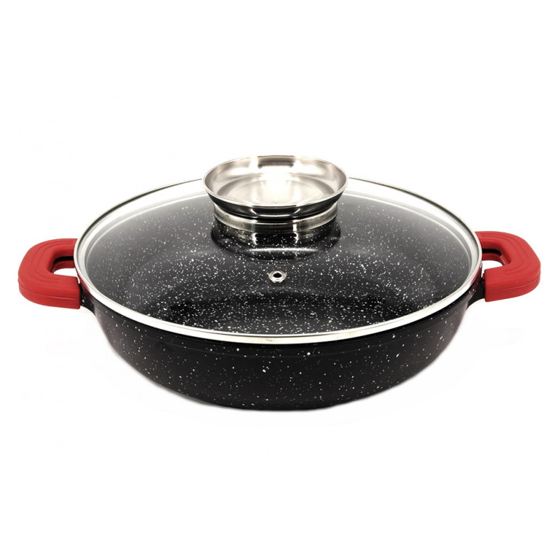 Сковорода - казан виготовлений з високоякісного литого алюмінію, покритого спеціальним мармуровим антипригарним покриттям. Унікальна конструкція дна забезпечує рівномірне нагрівання по всій поверхні. Сковорода жароміцна може використовуватися на плитах будь-якого типу, а також у духовці. Казан має скляну кришку та силіконові ручки, які легко встановлюються.