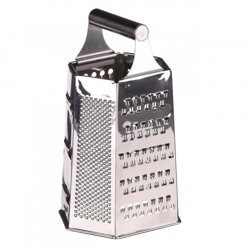 Тертка виготовлена з високоякісної нержавіючої сталі, яка не вступає в реакцію з їжею під час експлуатації, не змінює її смаку та запаху. Тертка для овочів має зручну ручку, шість робочих сторін з різними за формою та розміром лезами.