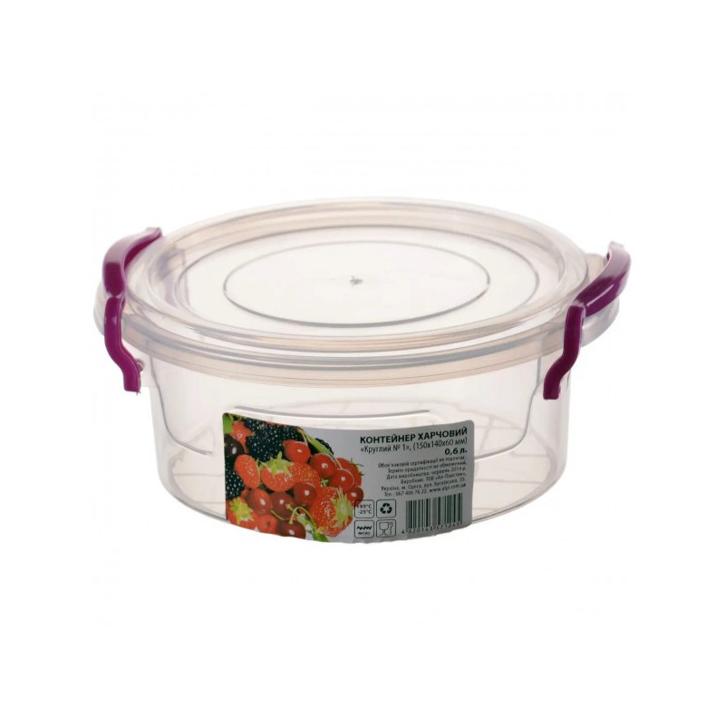 Бокс контейнер пластмасовий 0,6л універсальний, харчовий з ручками кліпсами, призначений для зберігання, транспортування продуктів чи готових страв та їх заморожування чи розігріву. Ємність круглої форми комплектується кришкою, яка щільно закривається та додатково фіксується ручками контейнера, це перешкоджає випадковому відкриттю кришки. Прозорі стінки судочка дозволяють бачити вміст у ньому.