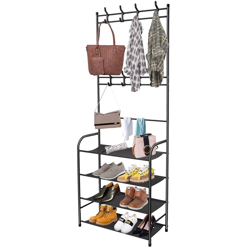 Вішалка для одягу та взуття виготовлена з міцних матеріалів, вона не впаде і може витримувати велику вагу. Вішалка для одягу має 8 гачків, взуттєва полиця вміщує близько 12 пар взуття. Комплект розрахований на максимальну вагу до 80кг. Вішалка для одягу проста у збиранні.