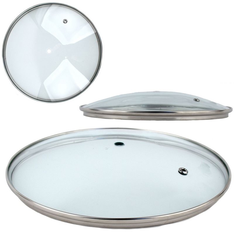 Скляна кришка з ручкою 32см виготовлена з термостійкого скла, вигнутої форми. Кришка має нержавіючий обідок, який перешкоджає сколу скла, а також отвір для відведення пари, що утворюється. Завдяки прозорому склу можна контролювати сам процес варіння, смаження або тушкування різних продуктів не піднімаючи щоразу кришку.