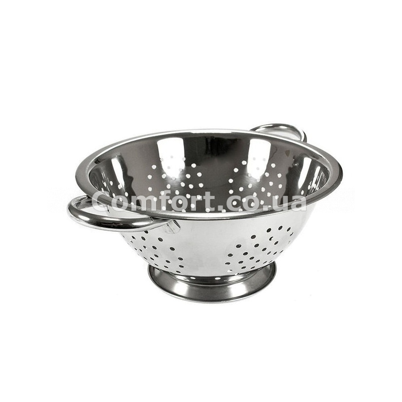 Друшляк металевий з ручками має стійку основу, призначений для відділення рідині від продуктів, зручно використати для миття овочів, фруктів і ягід. Друшляк виготовлений з нержавіючої сталі. Діаметр: 22см.