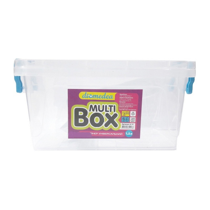Контейнер 1,5л А-13 універсальний, харчовий призначений для зберігання, транспортування продуктів або готових блюд і їх заморожування або розігрівання. Ємність прямокутної форми комплектується кришкою, яка щільно закривається і додатково фіксується ручками контейнера, це перешкоджає випадковому відкриттю кришки. Прозорі стінки судка дозволяють бачити вміст у ньому. Бокс виготовлений з високоякісного харчового пластика, який може контактувати з їжею, абсолютно безпечний для здоров'я, не містить шкідливих речовин. Підходить для: посудомийної машини, холодильника, морозильної камери, мікрохвильової печі.