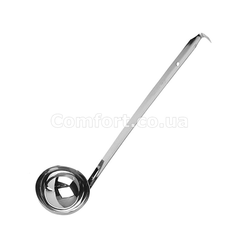 Половник - це кухонний пристрій для розливання рідкої їжі, який необхідний на будь-якій кухні. У кожному будинку, їдальні, ресторані є половник для розливу перших страв, соусів, компотів, киселів та інших рідин. Дана модель половника виготовлена з високоякісної нержавіючої сталі, яка не окислюється та не вбирає сторонніх запахів. Половник металевий середнього розміру, має довгу ручку, зручну для підвішування. Міцний і довговічний нержавіючий половник зручний і компактний, не займає багато місця. Стильний половник з нержавіючої сталі стане чудовим помічником при подачі соусів, супів та інших рідких страв. Лаконічний класичний дизайн половника підійде до інтер'єру кожної кухні. Об'єм 118мл. Довжина 37,5см.