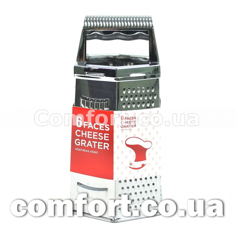 Терка металева використовується для овочів, фруктів, сиру, горіхів або шоколаду, має шість вигляду лез, для різних подрібнень. Терка необхідний предмет на кожній кухні, виготовлена з нержавіючої сталі.