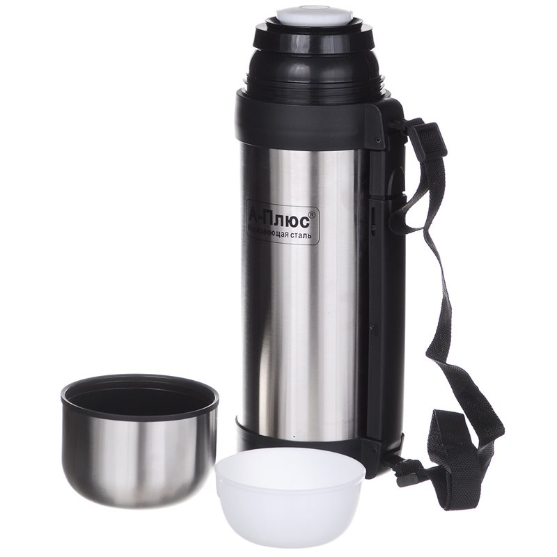 Термос металевий з широкою шийкою зручно брати з собою в поїздку або на пікнік, колба термоса виготовлена з нержавіючої сталі, стійка до механічних ушкоджень. Термос зберігає температуру гарячих і холодних напоїв. Кришку термоса можна використати в якості чашки. Після збереження перших або других блюд досить ретельно вимити і просушити термос і можна далі використати його для заварювання напоїв. Термос простий у відході після використання, комбінована пробка швидко розбирається і чиститься. Об'єм 1,5л.