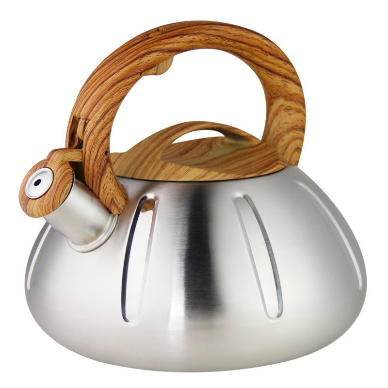 Чайник з матової нержавіючої сталі потрібний в кожному будинку, завдяки своєму оригінальному дизайну і кольору стали, який буде доречний практично у будь-якому інтер'єрі. Використовувана нержавіюча сталь для виробництва є якісним і надійним матеріалом, який не представляє небезпеці для здоров'я людини, має хорошу теплопровідність. Чайник оснащений простою системою відкривання і закривання кришки свистка за допомогою важеля на ручці чайника. Носик чайника широкий, тому можна наливати велику кількість води за раз. Є свисток, що оповіщає про закипання води. Об'єм: 3л.