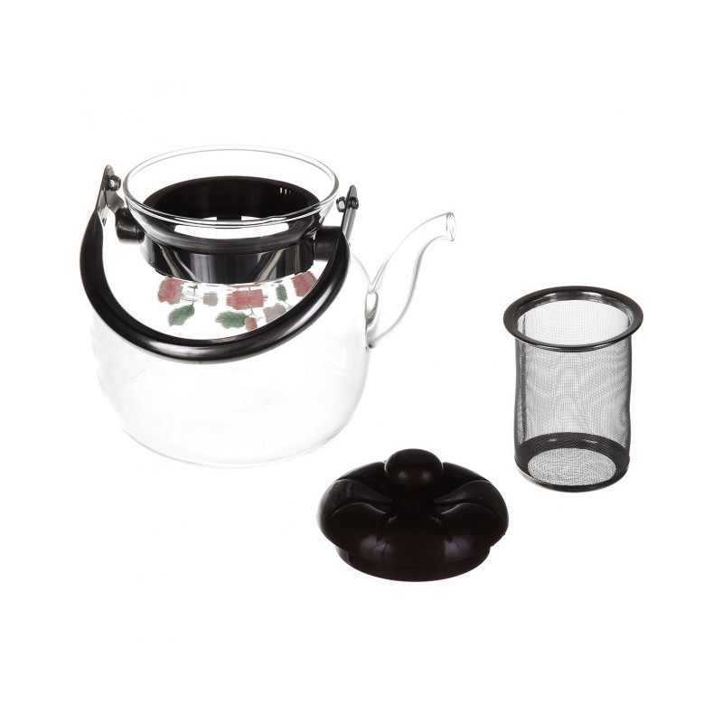 Чайник скляний має металеву заварювальну колбу, стильний і зручний, можна використати на газовій і електричній плиті. Чайник виготовлений з жароміцного скла, ручка і кришечка з пластмаси, що зручно при експлуатації.