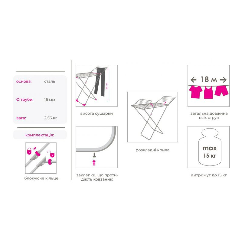 Сушарка для білизни має просту конструкцію - крила, що розсуваються, захисне епоксидне покриття, яке робить метал більш зносостійким, якісне кріплення, стійкі ніжки, красивий зовнішній вигляд. Ніжки сушарки розташовані так, що виключается перекидання, вони оснащені блокуючим кільцем, яке служить для захисту від непередбачуваного складання конструкції. Загальна робоча поверхня складає 18 метрів, максимально дозволене навантаження 15кг.
