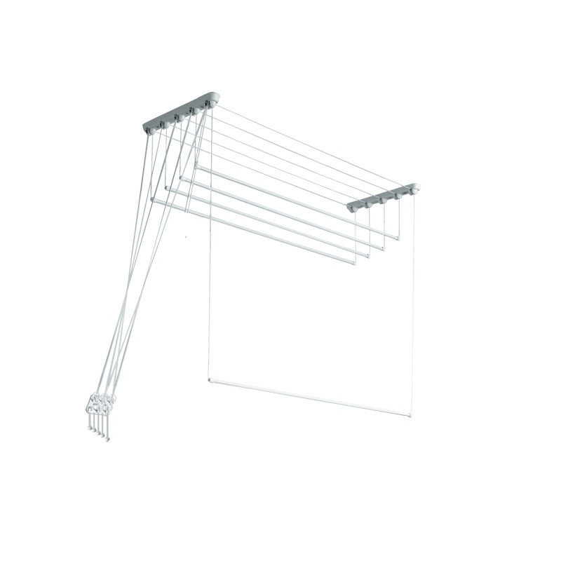 Сушарка для білизни стельового типу з мотузяним механізмом опускання планок, компактна і зручна, ідеально підійде для установки до ванної кімнати або на балкон. Білизняна сушарка має п'ять лозин, які легко опускаються і піднімаються, два пластмасові кронштейни, які кріпляться до стелі шурупами, а також пересувних вішалок, зроблених із сталевих трубок з вініловим покриттям. Вішалки кріпляться на шнурках, їх положення регулюється шнурками з двома утримувачами. Навантаження однієї вішалки, що допускається, 2,5 кг Спеціальний механізм стельової сушарки забезпечує підйом і опускання стержнів незалежно один від одного, що полегшує процес розвішування білизни і можливість зафіксувати стержні на будь-якій зручній висоті при вивішуванні, або коли висушену білизну необхідно зняти. В той час, коли стельова сушка не використовується для сушки білизни, вона не заважає пересуванню, відкриванню стулок балкона, не привертає увагу. Елементи багатофункціональної конструкції білизняної сушарки закріплюються на стелі. Сушарка для білизни в розібраному стані і вимагає складання, уся необхідна фурнітура для монтажу є в комплекті. Для установки білизняної сушарки необхідно прикріпити кронштейни до стелі за допомогою 4 шурупами і штифтів розпорів на відстані, визначеному завдовжки вішалок. Прикріпити до стіни скобу, фіксувальну шнурки з вішалками, шнурки протягнути через щілини в кронштейнах, укладаючи їх на роликах. Прикріпити на шнурки по двох утримувачів. За допомогою скоби фіксувати вішалки на відповідному рівні. Максимальне навантаження 12,5кг. Довжина однієї трубки : 2,1м. Ширина монтажної планки : 4,3м. Корисна площа: 10,5м. Виробник: Україна.