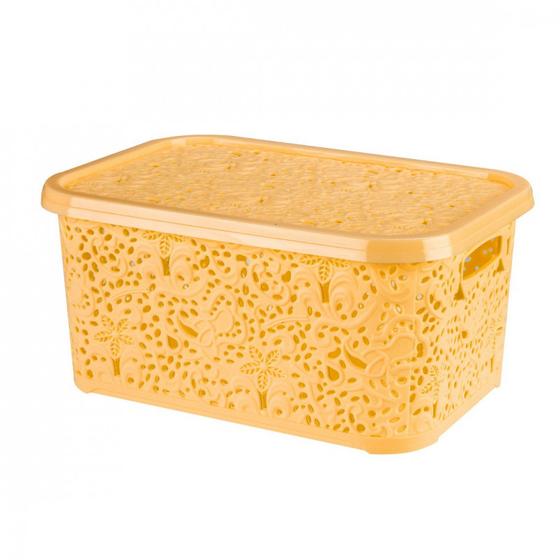 Кошик ажур 6л R з кришкою призначений для зберігання предметів, дрібних речей, чудово підійде для зберігання білизни, дитячих товарів, іграшок, косметики, канцелярського або швацького приладдя, і інших корисних дрібниць. Контейнер виготовлений з високоякісного кольорового пластика, безпечного для здоров'я. Конструкція органайзера для зберігання ажур з кришкою є прямокутним контейнером, на бічних стінках є отвори для циркуляції повітря, з їх допомогою кошик зручно переносити. Дизайн кошику ажур для зберігання відрізняється яскравістю, оригінальністю має унікальний вид. Пластиковий кошик з кришкою виконаний у вигляді ажурного візерунка. Органайзер для зберігання ажур з кришкою має широкий асортимент кольорів. Корзина для зберігання ажур з кришкою компактна, легка, міцна і містка, максимально підвищує рівень зручності, не вимагає особливого догляду. Кошик ажурний - стильний аксесуар для кожного будинку. Практичная корзина ажур для зберігання потрібна в кожному будинку, вона не залишить Вас без уваги.