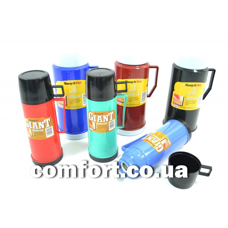 Термос пластмасовий із скляною колбою зручно брати з собою в потягу або на пікнік, підтримує температуру гарячих і холодних напоїв. Кришку термоса можна використати в якості чашки. Об'єм 1л.