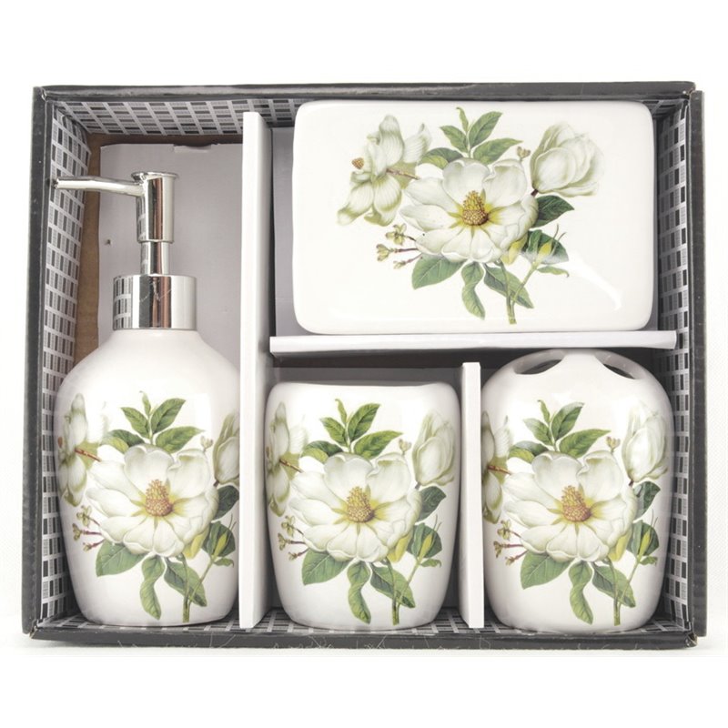 Набір для ванної кімнати включає дозатор для рідкого мила, стакан для зубних щіток, мильницю, стакан. Всі аксесуари для ванної кімнати зібрані в одному наборі та декоровані ніжним малюнком в одному стилі. Набір аксесуарів виготовлений з високоякісної кераміки. Даний набір доповнить та прикрасить дизайн ванної кімнати та стане чудовим подарунком для цінителів красивих речей для дому!