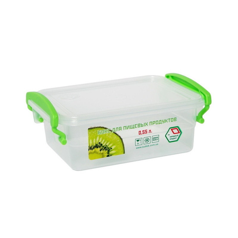 Контейнер 0,55л №51 харчовий з ручками засувками призначений для зберігання, транспортування продуктів чи готових страв та їх заморожування чи розігріву. Ємність має прямокутну форму, комплектується кришкою, яка щільно закривається і додатково фіксується ручками контейнера з двох сторін, це перешкоджає випадковому відкриттю кришки, тому Ви можете без проблем взяти з собою будь-яку страву. Бокс виготовлений з високоякісного харчового пластику, який може контактувати з продуктами, абсолютно безпечний для здоров'я, не містить шкідливих речовин, не вбирає запахів страв і не має свого. Прозорі стінки судочка дозволяють бачити вміст у ньому. Харчовий контейнер підходить для використання в посудомийній машині, холодильнику, морозильній камері, мікрохвильовій печі.