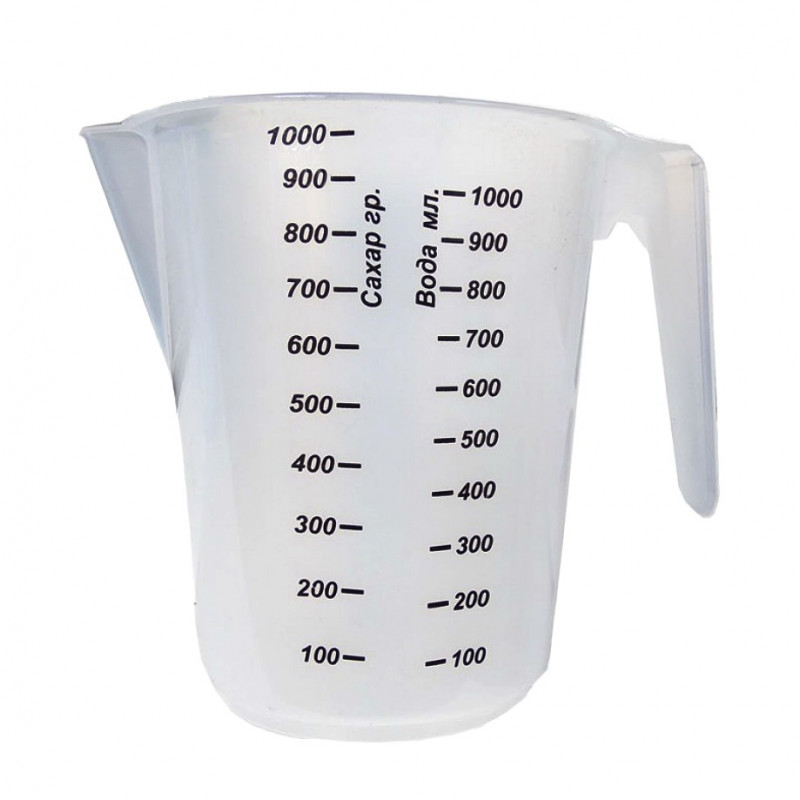 Кухоль мірний пластмасовий з ручкою і носиком використовується для виміру об'єму рідин, ваги цукру, борошна і інших продуктів харчування. Мірний кухоль необхідний предмет для приготування різних блюд, консервації, напоїв, особливо якщо в рецептурі треба точно і чітко дотримуватися пропорцій. На стінках кухля нанесена мірна шкала для виміру. Мірна ємність потрібний посуд на кухні і надійний помічник для кожної господині.