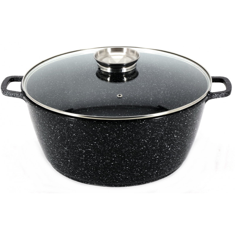 Каструля виготовлена з високоякісного литого алюмінію, покритого спеціальним мармуровим антипригарним покриттям, яке має високу теплопровідність. Унікальна конструкція дна забезпечує рівномірне нагрівання по всій поверхні. Жароміцна каструля може використовуватися на плитах будь-якого типу, в тому числі і індукційних, а також в духовках. До каструлі йде кришка з жароміцного скла з отвором для виходу пари та силіконові ручки, які легко встановлюються.