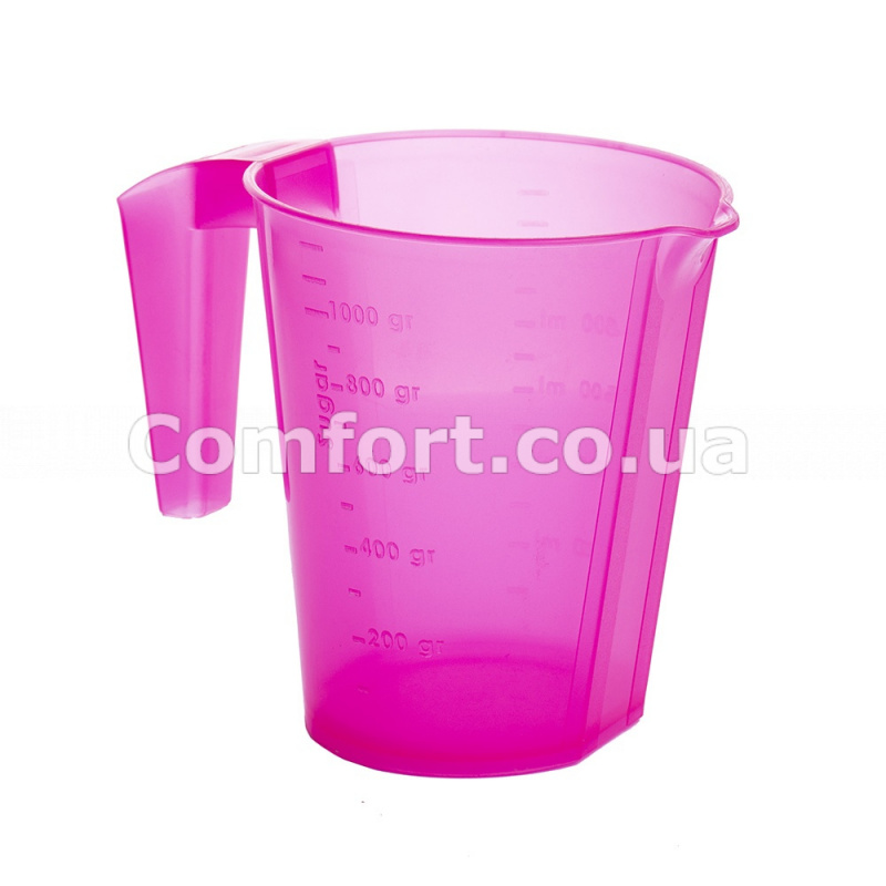 Кухоль мірний пластмасовий з ручкою і носиком використовується для виміру об'єму рідин, ваги цукру, борошна і інших продуктів харчування. Мірний кухоль необхідний предмет для приготування різних блюд, консервації, напоїв, особливо якщо в рецептурі треба точно і чітко дотримуватися пропорцій. На стінках кухля нанесена мірна шкала для виміру. Мірна ємність потрібний посуд на кухні і надійний помічник для кожної хазяєчки.