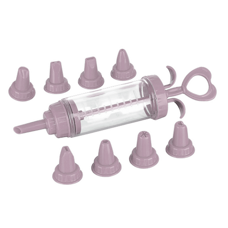 Кондитерський шприц AP-1004 з насадками призначений для приготування різноманітного печива, еклерів, прикраси та декорування кондитерських виробів у домашніх умовах або на кондитерському виробництві. Завдяки цьому кулінарному аксесуару можна надати необхідну форму тесту. Кондитерський шприц виготовлений з високоякісного, харчового пластику.Кулінарний шприц у комплекті має вісім насадок.