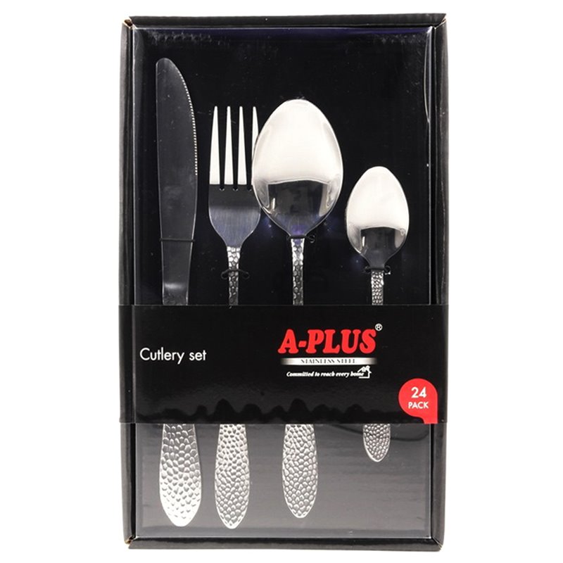 Набір складається з 24 столових предметів, для вашої зручності набір упакований в коробку для компактного зберігання, завдяки чому цей товар може бути відмінним подарунком . Предмети в наборі виготовлені з нержавіючої сталі високої якості. Цей метал не вступає в реакцію з їжею під час експлуатації, не міняє її смак і запах.