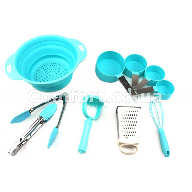 Набор кухонний з 6-и предметів стане прекрасним придбанням для кожної хазяйки. Леза терки для овочів і фруктів з високоякісної нержавіючої сталі відрізняються чудовими різальними характеристиками. Вінчик для збивання, друшляк доладною виготовлені з високоякісного харчового кольорового силікону, харчові щипці - силікон з нержавіючою ручкою. Толкушка для картоплі і мірні ложки виготовлені з кольорового пластика вищого сорту. Практичне руків'я із спеціального силікону, пластика і нержавіючої сталі зручно лежать в руці і не ковзають. Усі кухонні предмети легко миються, практичні і зручні у використанні, підходять для посуду з керамічним і антипригарним покриттям. Кухонний набір ідеально підходить для зберігання в кухонній ящику або його можна зафіксувати для зручності на стіні. Оригінальний кухонний набір в коробці можна сміливо використати в якості подарунка.