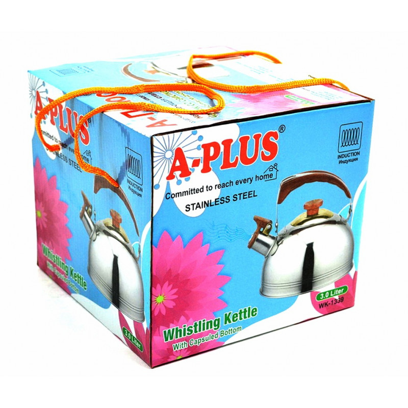 Чайник металевий зі свистком виготовлений з високоякісної нержавіючої сталі з дзеркальною поліровкою. Чайник відрізняється надзвичайною міцністю і довговічністю, має високі гігієнічні і антикорозійні властивості, а також не вимагає особливого відходу і легко миється. Оснащений чайник пластиковою ручкою, що не нагрівається. Завдяки свистку Ви точно знатимете про момент закипання води. Об'єм: 3л. Діаметр: 19см.
