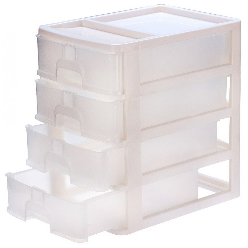 Комод міні настільний великий має чотири прозорі висувні ящики, в які легко поміщаються усі необхідні дрібниці. Комод використовується для зберігання офісного паперу формату А4, в один ящик вміщується до 500 штук листів, так само зручно складати канцелярське приладдя, предмети для творчості, кольорові олівці, дитячі іграшки, предмети особистої гігієни, косметику, серветки і інші необхідні дрібниці. Комод міні виготовляють з кольорової високоякісної пластмаси. Пластиковий міні комод практичний і компактний, стійкий до перепадів температури, що дозволяє розміщувати його у ванні, на кухні, в дитячій, в коморі кімнаті і у будь-кому другом необхідному приміщенні. Комод зручний і швидко збирається, а завдяки незначній вазі його можна легко переносити до будь-якої кімнати. Міні комод допомагає упорядкувати дрібні речі, це необхідний предмет для тих, хто любить порядок і вважає за краще, щоб кожна річ мала своє місце. Розміри: 35,5х25, 5х38см. Виробник: Україна.