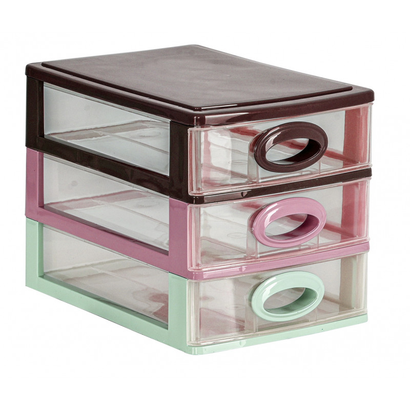 Комодик міні якість має три прозорі висувні ящики, в які легко поміщаються усі необхідні дрібниці. Комод настільний використовується для зберігання офісного канцелярського приладдя, предметів для творчості, кольорових олівців, дитячих іграшок, предметів особистої гігієни, косметики, серветок і інших необхідних дрібниць.