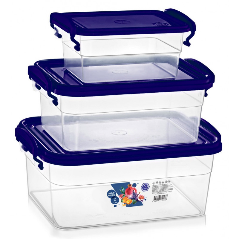 Набір харчових боксів судочків з ручками кліпсами 1,6л+3л+5л №109 незамінний для зберігання, перевезення, розігріву в мікрохвильовій печі та заморожування продуктів. Набір харчових контейнерів має прямокутну форму, судочки комплектуються кришкою, яка щільно закривається і додатково фіксується ручками контейнера з двох сторін, це перешкоджає випадковому відкриттю кришки, тому Ви можете без проблем взяти з собою будь-яку страву. Бокси судочки виготовляються з високоякісного харчового пластику, який може контактувати з їжею, абсолютно безпечний для здоров'я, не містить шкідливих речовин, не вбирає запахів страв і не має свого.