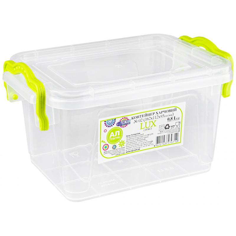 Бокс контейнер пластмасовий LUX 0,8л універсальний, харчовий з ручками засувками, призначений для зберігання, транспортування продуктів чи готових страв та їх заморожування чи розігріву. Ємність прямокутної форми комплектується кришкою, яка щільно закривається та додатково фіксується ручками контейнера, це перешкоджає випадковому відкриттю кришки. Прозорі стінки судочка дозволяють бачити вміст у ньому. Бокс виготовлений з високоякісного харчового пластику, який може контактувати з їжею, абсолютно безпечний для здоров'я, не містить шкідливих речовин. Судочок харчовий з ручками засувками підходить для використання в посудомийній машині, холодильнику, морозильній камері, мікрохвильовій печі.