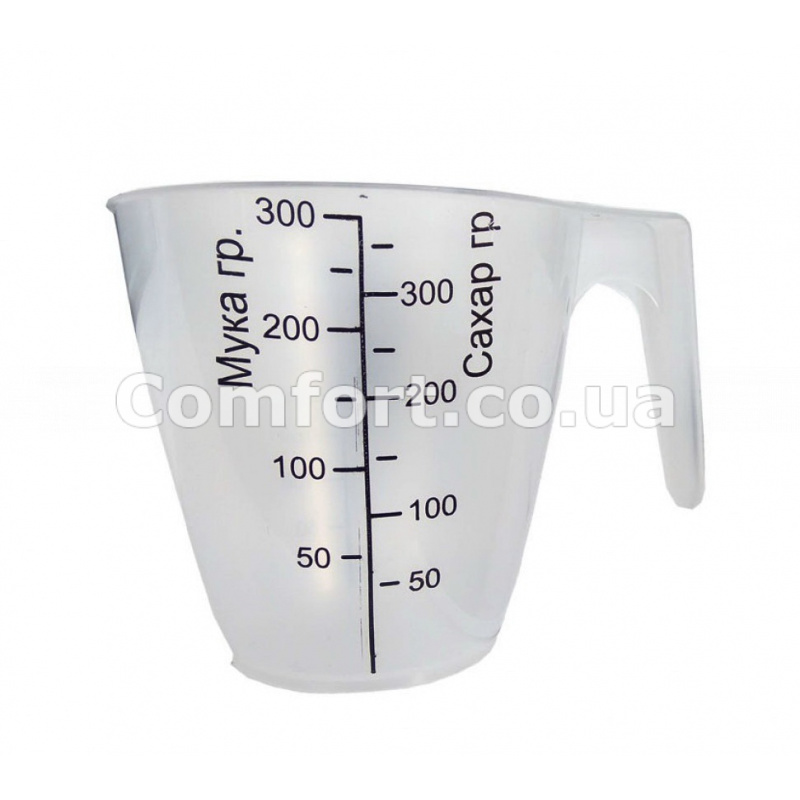 Кухоль мірний пластмасовий з ручкою і носиком використовується для виміру об'єму рідин, ваги цукру, борошна і інших продуктів харчування. Мірний кухоль необхідний предмет для приготування різних блюд, консервації, напоїв, особливо якщо в рецептурі треба точно і чітко дотримуватися пропорцій. На стінках кухля нанесена мірна шкала для виміру. Мірна ємність потрібний посуд на кухні і надійний помічник для кожної хазяєчки.